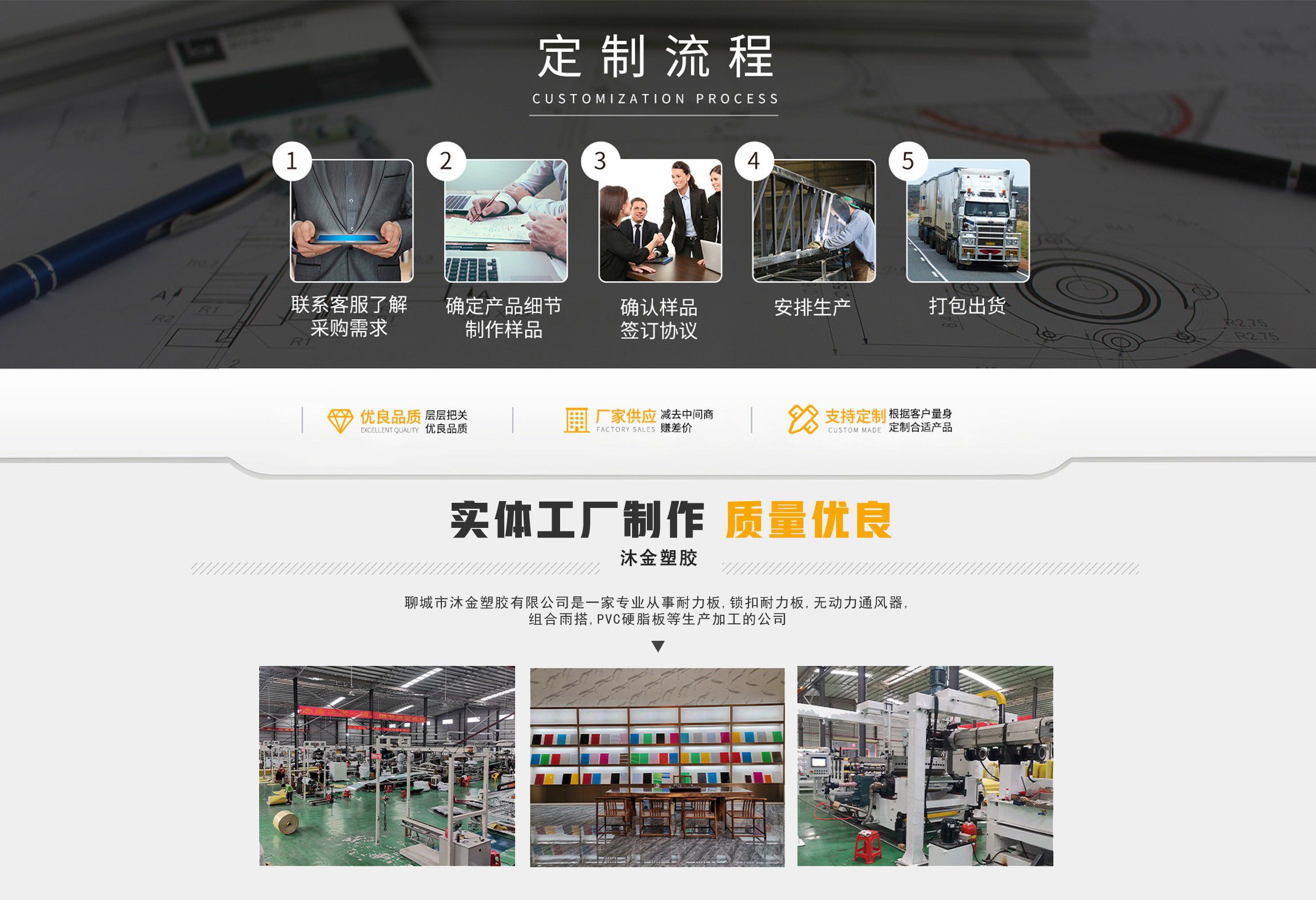 聊城市沐金塑膠有限公司注冊資金2180萬元,占地20000余平方,擁有自建廠房15000平方,員工100余名。10余年來,公司主營耐力板,鎖扣耐力板,耐力板深加工,無動力通風器,組合雨搭,PVC硬脂板,耐力板廠家等板材的發展戰略,逐漸成長為綜合性企業?! 」緭碛卸鄺l板材共擠生產線,采用世界知名品牌進口原材料和先進工藝,依據完善的ISO9001質量管理體系和ISO14001環境管理體系,為產品的卓越品質提供了強有力的保證。憑借過硬的創新能力和堅實的硬件基礎,贏創已成為國內領先的熱塑性板材生產商,產品被廣泛應用于建筑業、農業、工業、廣告業、安防行業及DIY領域?! 」臼冀K致力于通過提供最優的板材應用解決方案,為客戶創造最高的價值;堅守創新、質量、靈活、服務和速度的核心價值觀;堅持“完美的產品需要完美服務的支持”的經營理念,努力實現成為世界領先的板材與解決方案供應商的夢想?! ≡谖磥?,公司將立足客戶需求,不斷改變和完善現有產品,拓展產品線和充分開發板材的應用領域,為客戶創造全方位的價值。同時更好地實現員工的價值,實現公司團隊的價值。我們將與您一起創贏未來!  企業使命:成為世界領先的板材與解決方案供應商?! 」驹妇埃和ㄟ^提供最優的板材應用解決方案,為客戶創造最高的價值?! 『诵膬r值觀:質量...